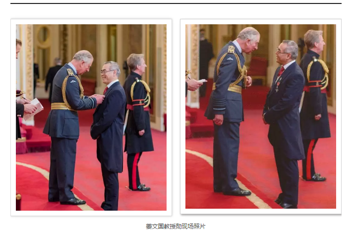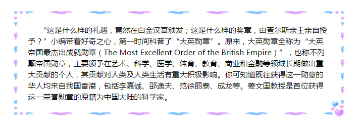 2017年3月16日,英國卡迪夫大學(xué)的華人科學(xué)家姜文國教授在倫敦白金漢宮接受了英國王儲(chǔ)查爾斯親王親自授予的2017年度“大英勛章”,表彰其在“國際癌癥研究方面的突出貢獻(xiàn)”, 成為首位獲得這一榮譽(yù)勛章的原籍為中國大陸的科學(xué)家。