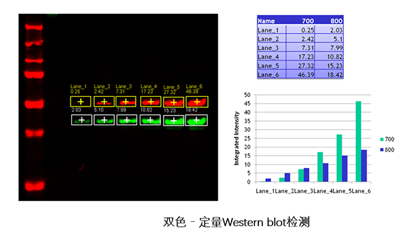 Odyssey 近紅外熒光成像系統采用兩種不同的近紅外雙色熒光染料同時檢測,例如:可用兩種不同近紅外熒光染料標記的抗體分別與兩種蛋白反應從而達到在同一張膜上檢測兩種不同的蛋白的目的。