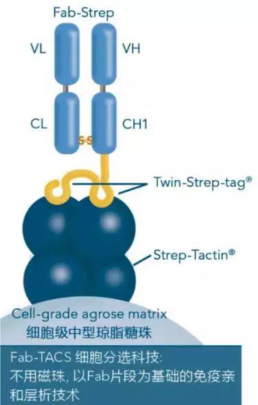 以Fab片段為基礎的無痕親和細胞分選技術(traceless affinity cell selection, Fab-TACS),由IBA Lifesciences根據其獨家的Strep-tag?/Strep-Tactin?蛋白純化系統發展而來。Fab-TACS運用免疫親和層析的原理,利用細胞表面抗原分子CD marker與Fab片段的特異性結合來進行捕捉及釋放目標細胞。以不具磁性且可逆的試劑,取代一般具高親和力的完整抗體, 直接由全血或其他血液樣本來進行溫和的標準化分選,因此能精準的提供您不含標記、未被活化的目標細胞。