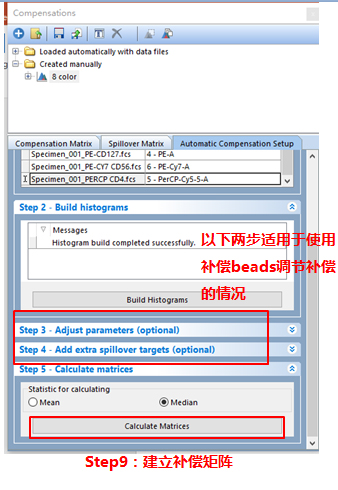 依次調整好各單管Control的Marker門的位置。此處不一一列舉。回到補償界面。此處的3、4適用于使用補償beads調節補償的情況(由于本次數據為細胞,此處不詳細列出,如對此步驟感興趣,可咨詢小達君)
