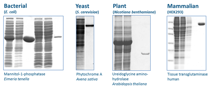 依據研究項目的不同,各實驗室使用不同的表達系統,常用的有大腸桿菌、哺乳動物細胞、酵母、昆蟲細胞或是植物細胞等。如果使用哺乳動物細胞來表達目的蛋白,His-tag就不適合,因為系統中的組氨酸會干擾其純化效果。而Strep-tag?系統則與這些表達系統都能互相搭配。請見下圖實驗數據: