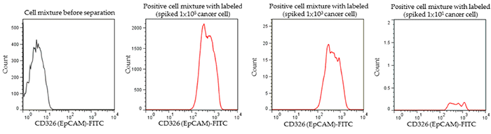 使用耦連EpCAM抗體的磁珠從含有結(jié)腸癌細(xì)胞系(HCT116)細(xì)胞的全血樣品中富集CTC,并用CD326 (EpCAM)- FITC對(duì)細(xì)胞進(jìn)行熒光染色,流式細(xì)胞術(shù)分析同時(shí)BioMab公司也推出了一款CTC檢測試劑盒(CTC Staining kit, Cat#PN019-S01),通過免疫熒光法檢測富集到的CTC。DAPI+ CK+ CD45-的細(xì)胞即為CTC。