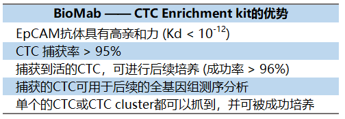 腫瘤患者血液中存在少量循環(huán)腫瘤細(xì)胞以及由壞死癌細(xì)胞釋放的少量循環(huán)腫瘤 DNA。通過檢測血液中的循環(huán)腫瘤細(xì)胞和循環(huán)腫瘤DNA(ctDNA,cycle tumor DNA)對(duì)患者腫瘤進(jìn)行診斷與監(jiān)測的方法被稱為液體活檢。相比于傳統(tǒng)的活檢方法,液體活檢的主要優(yōu)勢是創(chuàng)傷較少、操作簡單、能重復(fù)取樣,非常方便進(jìn)行實(shí)時(shí)動(dòng)態(tài)檢測。CTC作為目前液體活檢的主要指標(biāo)之一,在乳腺癌、結(jié)直腸癌、肺癌、前列腺癌等疾病中,已被證明其數(shù)量與患者的無進(jìn)展生存期和總體存活率相關(guān)。在乳腺癌中,CTC檢測是一種比影像技術(shù)更好的預(yù)測治療效果的方法,與局部采集的腫瘤樣本相比,CTC能更好地反映腫瘤進(jìn)展。CTC檢測應(yīng)用于臨床主要集中在早期篩查、輔助腫瘤分期、動(dòng)態(tài)監(jiān)測、預(yù)后評(píng)估、復(fù)發(fā)和轉(zhuǎn)移預(yù)警等方面。一般來說,外周血中CTC的數(shù)量極少,1ml血液中約有4×109紅細(xì)胞、2×108血小板、6×106白細(xì)胞,而CTC只有1-10個(gè),因此CTC的檢測面臨巨大的技術(shù)挑戰(zhàn)。常用的CTC富集方法包括非特異性富集法和特異性富集法。非特異性富集法主要是依據(jù)形態(tài)學(xué)原理,包括:密度梯度離心法、過濾法、細(xì)胞電學(xué)特征法等,這種非特異性的方法往往具有一定的局限性,如:富集效率低、靈敏度和特異性較低、易受細(xì)胞形態(tài)影響等。特異性富集法多數(shù)是依據(jù)抗原抗體原理,包括:免疫磁珠富集法、芯片法、納米粒富集法等,其中免疫磁珠法又分為陰性富集(負(fù)選)和陽性富集(正選),常見的陰性富集法是利用耦連CD45抗體的磁珠吸附白細(xì)胞,在磁場作用下去除白細(xì)胞,富集CTC;陽性富集是通過耦連EpCAM抗體的免疫磁珠捕獲EpCAM陽性的CTC,適用于EpCAM或CK陽性的CTC。基于此原理,BioMab(百優(yōu)生醫(yī))公司利用其高親和力的EpCAM抗體(EpAb3-5)研發(fā)了CTC正選試劑盒(CTC Enrichment kit, Cat#PN019-02)。部分實(shí)驗(yàn)數(shù)據(jù)