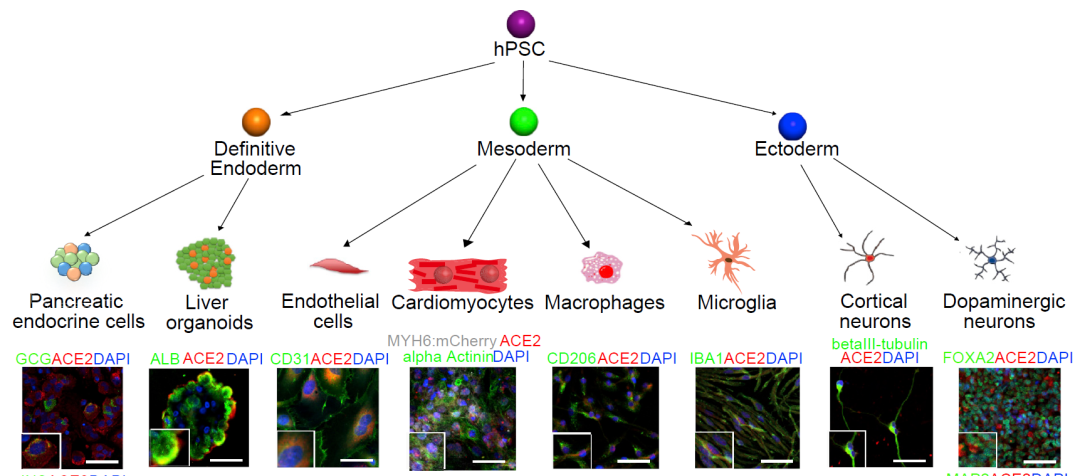 Yang等人的研究表明,hPSC來源的細胞和類器官為研究SARS-CoV-2的趨向性和COVID-19的造模提供了有價值的模型。hPSC來源的胰腺內分泌細胞、成體肝細胞和膽管細胞類器官對SARS-CoV-2易感。