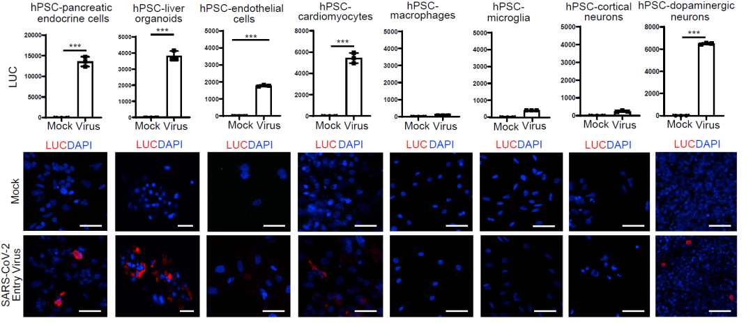 作者提出了一個由人類多能干細胞(hPSCs)的細胞和類器官組成的實驗平臺。具有刺突結構的假病毒可感染胰腺內分泌細胞,肝類器官,心肌細胞和多巴胺能神經元。最近的一些臨床研究表明COVID-19還與糖尿病關系密切。
