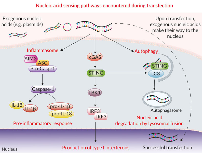 真核細胞轉染過程中,外源核酸(如質粒DNA)進入細胞會遇到一些阻礙,一方面胞質DNA和RNA感受器(如RIG-I樣受體,cGAS和炎癥小體)會識別這些外源核酸, 另一方面外源核酸需要避開防御性機制(如自噬),因此外源核酸引起的信號級聯激活通常會導致細胞轉染效率降低和細胞活力降低。