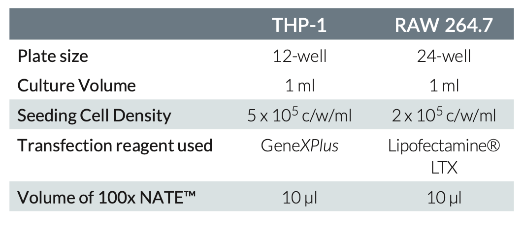 (下表是使用NATE轉染THP-1或RAW264.7細胞的示例)