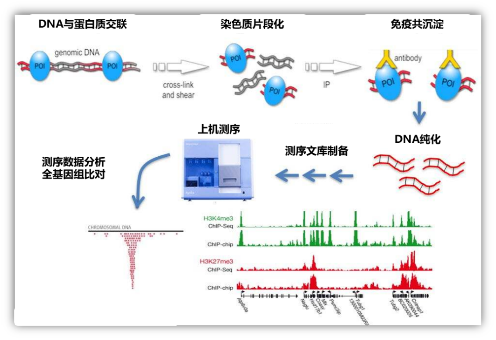 首先通過染色質免疫共沉淀技術(ChIP)特異性地富集目的蛋白結合的DNA片段,并對其進行純化與文庫構建;然后對富集得到的DNA片段進行高通量測序。通過將獲得的數百萬條序列標簽精確定位到基因組上,從而獲得全基因組范圍內與組蛋白、轉錄因子等互作的DNA區段信息。