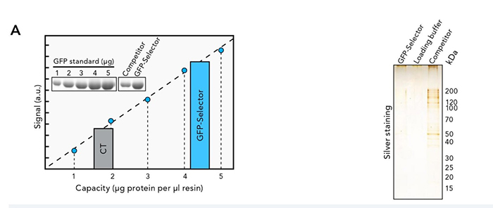 將相同體積的GFP selector和競爭產品分別與不含任何GFP標記蛋白的HeLa裂解物一起孵育,洗滌后,產物通過SDS-PAGE分離并進行銀染色分析。