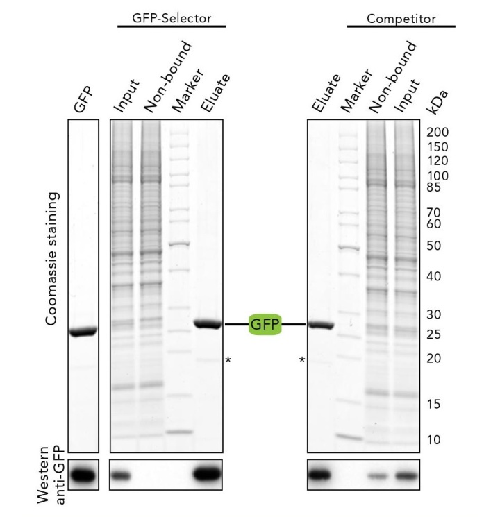 將等量GFP Selector和競爭產品與1ml含GFP標記蛋白的HeLa裂解物一起孵育,通過考馬斯染色和蛋白印跡分析上樣、洗滌產物、洗脫產物。
