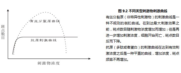 其一、非特異性的刺激物刺激效果不穩(wěn)定。如圖9.2所示,非特異性的刺激物(有絲分裂原Mitogen)的刺激曲線幾乎沒有平坦的部分。也就是說,刺激物的濃度有細微變化,馬上就會體現(xiàn)在刺激斑點數(shù)目的變化上了,這樣實驗結果很難完全重現(xiàn)。相反,抗原的刺激曲線非常平坦,只要達到有效刺激濃度,斑點頻率就不再變化。