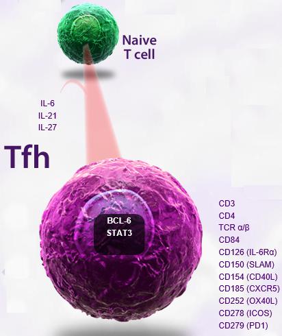 主要標記物:Tfh 細胞屬于 CD4+ T 細胞亞群,其表型特征為 CXCR5+CD40LhiICOShi ,并且還表達細胞因子 IL-21 和轉(zhuǎn)錄因子 Bcl-6 。 IL-21 和 Bcl-6 ( B-cell lymphoma 6 )對于 Tfh 細胞的發(fā)生和發(fā)育至關(guān)重要。其中 IL-21 誘導(dǎo) Tfh 的分化并促進其表面 CXCR5 的表達; Bcl-6 對于 Tfh 轉(zhuǎn)移到淋巴濾泡和 B 細胞發(fā)生中心( Germinal center )的形成必不可少。