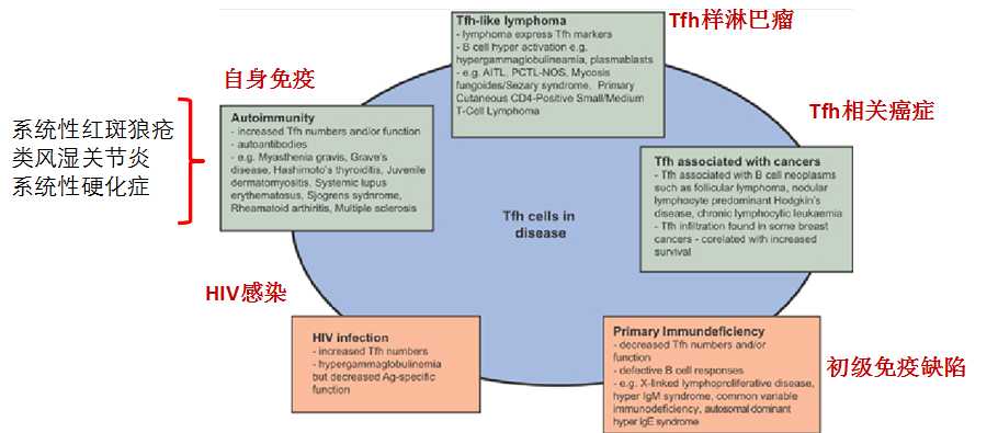 因此,基于 Tfh 細胞的功能特性,其與多種疾病密切相關(guān)。 Tfh 細胞及相關(guān)分子的缺陷會導(dǎo)致正常的 B 細胞反應(yīng)不能完成,產(chǎn)生體液免疫缺陷。相反, Tfh 功能亢進也會導(dǎo)致病態(tài)的自身免疫反應(yīng),介導(dǎo)自身免疫病的發(fā)生。目前對 Tfh 的研究也主要集中在其與自身免疫疾病和 HIV 的關(guān)系上面。