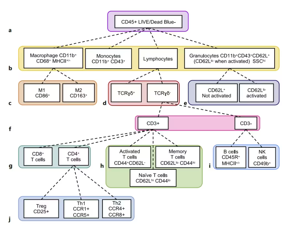 大鼠模型是生物醫(yī)學研究中重要的資源,因與人類免疫系統(tǒng)相似,而常被用于免疫相關的功能研究。然而目前小鼠模型在基礎和機制免疫學研究中占主導地位,相對缺乏對大鼠模型中免疫細胞的流式分析鑒定。本文將分享對大鼠常見免疫細胞的流式鑒定方案,鑒定分析不同組織中的粒細胞、巨噬細胞、T細胞、B細胞及NK細胞。