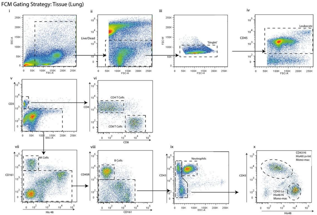 5. 中性粒細胞:從CD45+CD3-CD161-CD45R-的細胞中,圈出CD43+細胞(ix);