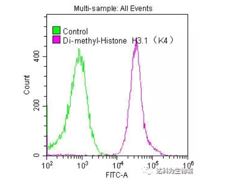 圖4. 使用1:50 稀釋的Histone H3.1K4me2單克隆抗體(貨號(hào):A68400)對(duì)HeLa細(xì)胞進(jìn)行染色的覆蓋直方圖。