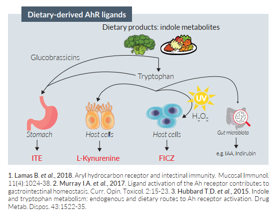 除了像2,3,7,8-四氯雙苯環二噁英(TCDD)的環境中的異質物,多種膳食來源的AhR配體也已經被鑒定出,而其中許多是色氨酸(Trp)氨基酸代謝的副產物4?,F在AhR已被認知為宿主微生物群落共生的調節因子。一方面,膳食配體激活的AhR幫助塑造腸道細菌組成5,另一方面,AhR傳感能夠調節腸道免疫細胞的穩態和功能6。